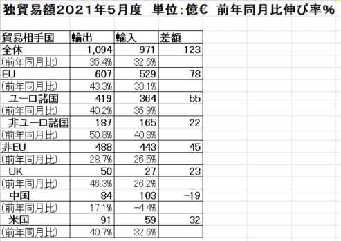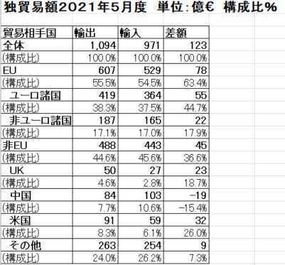 2021年5月の独の輸出をみると 1,094億€であり、