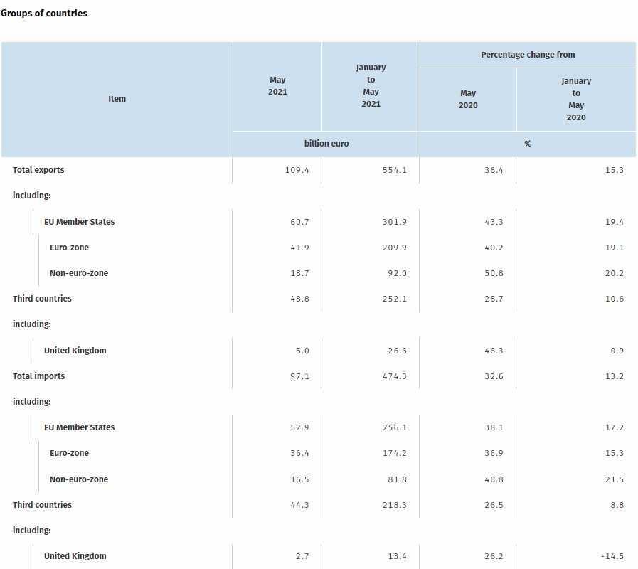 2021年5月の貿易収支をみると+123億€であり、