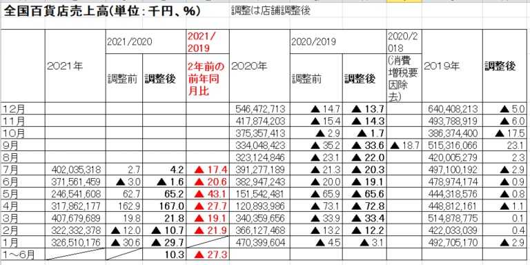 全国百貨店協会から2021年7月度の伸び率が公表された。
