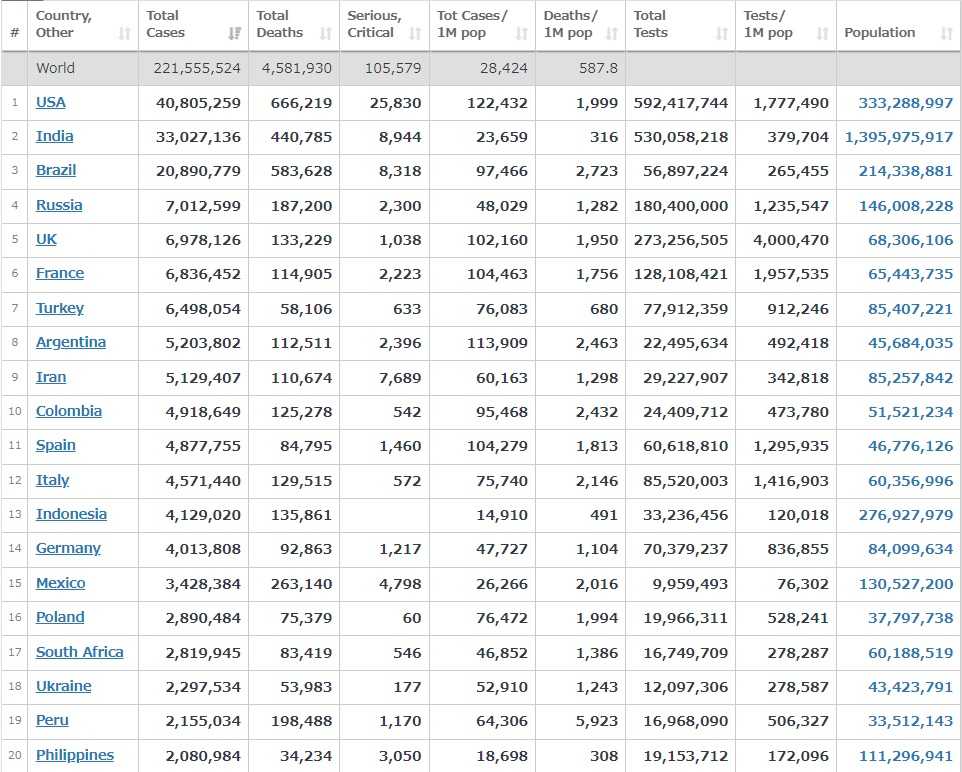 1位・・・USA     =40.8百万人 →感染率/人口=12.2%