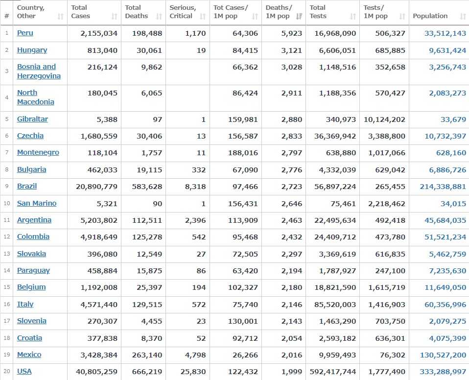 6.上位の 「死者数/人口百万人当たり」 の国順位