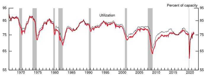 2.米国の稼働率=「実生産指数/生産能力指数」(%)