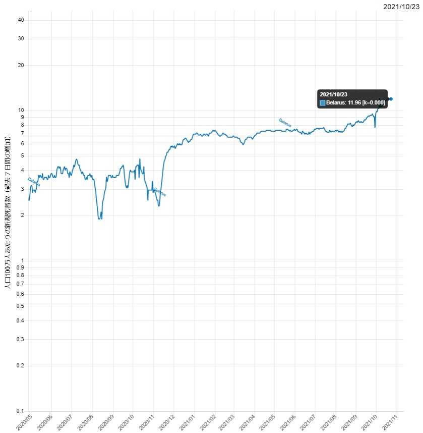 (4)ベラルーシの新規感染者の直近7日間平均/人口百万人当たり