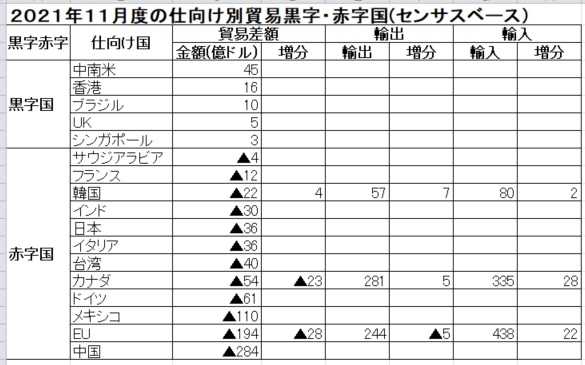 6.米国の2021年11月のモノの仕向け地別貿易差額(名目)