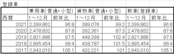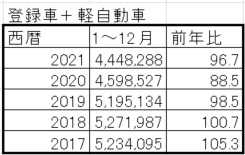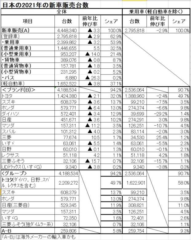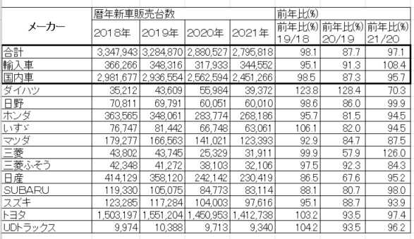 ​​日本の2021年の車種別、主要メーカー別の新車販売実績