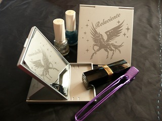 またまた お友達の工房さんに作っていただいたものをご紹介 ペガサスの絵柄のコンパクトミラーは、ふたつ折りで バックの内ポケットやポーチの中に入ります。超薄型なので 人前で出した時も上品ですね化粧室に行くほどでもないけれど ちょっと顔をみたいとき さりげなく出せて便利♪実は、内側にコクトーの詩を彫ってもらっているのです左のものは、お誕生日にいただいたものですが、これはペガサスとは違い、段階調節ができるのです。 しかも5段階眉を書くときなど、とても便利ですこれをもらってからは、ドレッサーの前でなく テーブルの上でちょっとお手入れなどが多くなりました昨日も 顔を洗ったあと、テレビを見ながら マッサージとリンパマッサージをやりました移動できる? 持ち運びできる? とても便利です(*∩_∩*)家の中での携帯用コンパクトミラーに なっています^^;気になる商品 マンゴーのボディシャンプーを持っているけれど すんごいいい香りアロマ効果もあってGOODかも。。大好きなシュウウエムラ(*∩_∩*) 立ち仕事なので、静脈瘤にならない為に・・とこういうソックスを仲良しドクターに薦められた事があります。 履いているだけでリンパマッサージ効果・・優れものかも