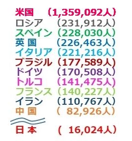感染者急増で武漢肺炎感染者数世界第2位に躍り出たロシア。最近やたら感染者が増えてイタリア、スペインを追い抜くとは予想だにしなかった。異常としか言いようがない。まあ、武漢コロナは変異し易いウイルスだと言われてきたし、変異を繰り返して感染力と毒性が向上した株が拡散しているのかもしれない。中国の感染者は現在8万2926人と発表されてるがこの数字は嘘だろう……実際にはこの百倍ないし千倍の感染者がいてもおかしくない国だ。だから本当はロシアは世界第3位なんだろうけど、いつまでこの状況が続くのだろうか?ロシアの新型ウイルス感染者が23万人突破 世界2位の多さに
