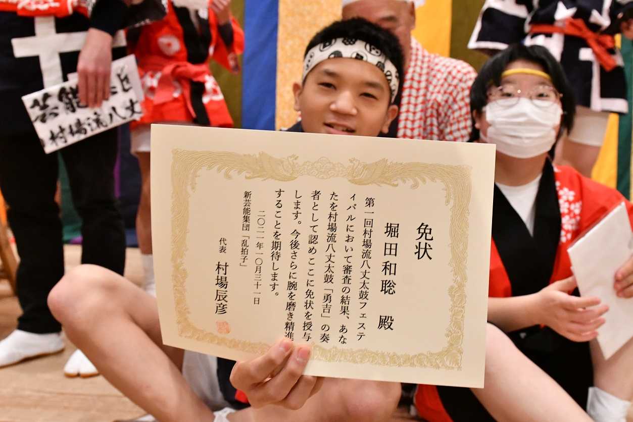 村場流八丈太鼓「勇吉」の奏者と認められたメンバー7人と師範と認められた4人に免状を手渡しました。