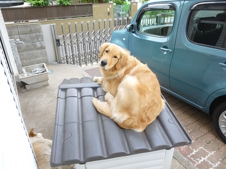 ここ2~3日雨が続く犬の散歩も行けず運動不足散歩ができないときはダイエットしようジュピは本当に変わった犬だ犬小屋の上で一休みてネコか~