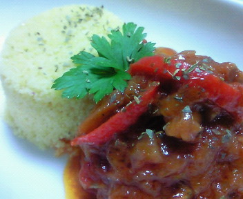『チキンのトマト煮クスクス添え』の覚え書。1、鶏肉には塩コショウと酒をふりかけておく。2、ニンニクみじん切り。3、玉ねぎ・パプリカをスライス。 (好みでズッキーニとかナスを入れても良い)4、オリーブオイルにニンニクを入れ香りが出たら 玉ねぎを入れしんなりするまで炒める。5、鶏肉を加え更に炒め、マッシュルーム・パプリカ等を 加える。6、トマト缶・赤ワイン・ブイヨンを入れて15分煮る。7、最後にドライハーブと塩コショウで味を調える。8、別の鍋にお湯250cc、塩小さじ1、オリーブオイル大さじ1 を入れ沸騰したら、いったん火からおろしクスクス250gを 加える。9、2分置いてバター小さじ2を入れフォークでかき混ぜながら 弱火に数分かける。10、更に盛ってできあがり♪