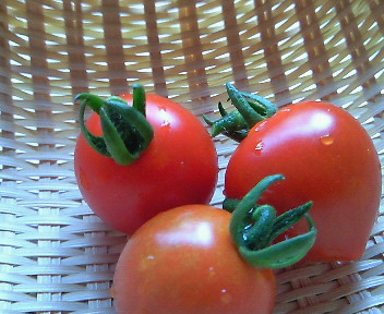 今季初収穫のミニトマト3つ!ほのかに香る夏の匂い!ほんのり残る甘味!美味いっす~♪でも・・・・・・、皮・・・・・・・、カッチカチやぞ!!(-ε-。)・・・・・・