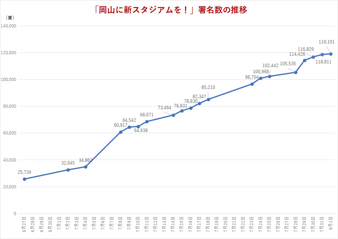 _署名活動がスタートして早くも1か月余りが経過し、残すは、あと2か月しかない。 8月1日現在で、119,101筆。この数字が多いのか少ないのかわからない。評価するのは、あくまでも署名を受け取る側の知事や県議会だ。 まずは、何としても、1筆でも多くの署名を集め、この署名活動を成功させたい。 この週末にも、イベントや祭りの主催者の方々にご配慮いただき、各地で署名活動を行いますので、ご協力よろしくお願いします。✍️今週末の署名活動予定・7/31 19:00-終了まで📍吉備津神社 宮内踊り・8/2 16:00-終了まで📍曽根小 ふれあいまつり・8/2 18:00-20:00📍夏まつり里庄・8/3 6:00-9:00📍備前岡山京橋朝市多くの方のご協力をお願いします!「記入済み署名用紙」のお持込みもお待ちしております! pic.twitter.com/9NDjwoezKg— 新スタジアムの整備を推進する会 (@okymshinsta) July 28, 2025 にほんブログ村