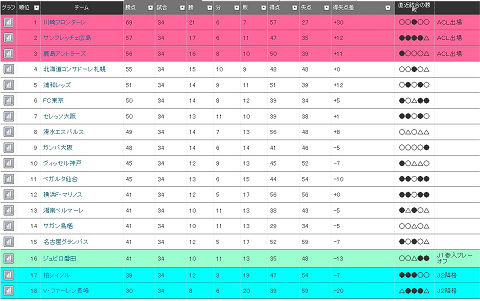 _現在12位のファジアーノは、勝ち点33。残り13試合で、残留ラインとされる勝ち点40までには、まだまだ、試練が待ち受けている。 残り13試合、残留の可能性は、こんな感じだろうか?(※引き分けは考慮せず) あと0勝 33 E判定 あと1勝 36 D判定 あと2勝 39 C判定(ボーダーライン) あと3勝 42 B判定 あと4勝 45 A判定 それにしても、2018年はえぐい これまで、10位以上には3勝3分け8敗といった中で、広島と鹿島にアウェイでの勝利が光る。 一方で、11位以下には、6勝3分け2敗と大健闘。ここでの勝ち点上積みがカギとなる。 今シーズン開幕当初は、なかなかアウェイで勝てなかったが、現時点では、大きな差はなくなってきた。 ホーム 5勝3分け5敗 アウェイ 4勝3分け5敗 にほんブログ村