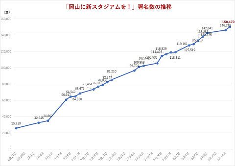 _署名活動は9月末までだが、6月下旬にスタートして、そろそろ折り返し点。 お盆と言うことで、親戚や岡山を離れた同級生や友人などと会う機会も多いと思われる。 是非、帰省された方は、ふるさと岡山の未来のために、新スタジアムの署名について協力いただきたい。 また、県外に戻っても、署名の輪を広げていただきたい。
