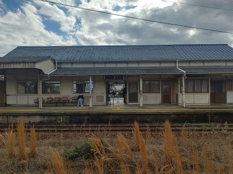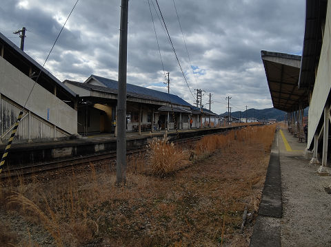 周防高森駅。かつて山陽本線だったころの名残だろうか、不釣り合いなくらい長いホーム。