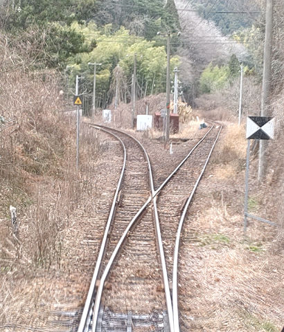 川西駅の手前で、錦川鉄道と分岐する。(※画像は車両後方から撮影)