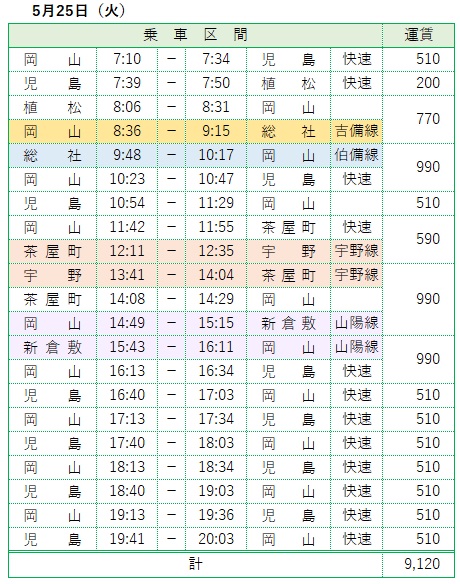 今日は、児島6往復、総社・宇野・新倉敷各1往復で、9,120ポイント分乗車。