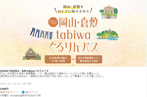 (ICOCAでGO)岡山・倉敷 tabiwaぐるりんパス を、3,900円で購入。