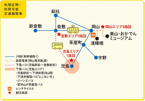 このパスには、後楽園、大原美術館などに無料で入場でき、バス、路面電車、レンタサイクルなども利用できる。