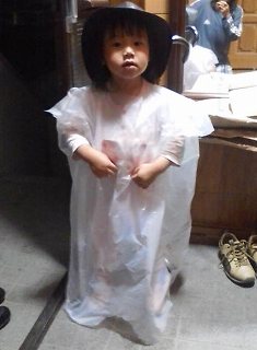 我が家から帰宅しようとする姪っ子。 半透明のゴミ袋使用。。ぼうし=おばあちゃんの 階段を下りて行くだけで豪雨にやられる。。 そんな夜でした。