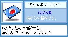 どもども、蓮です。昨日の波状さんとこのイベントで3位に入ったわけですがさっそく賞品が届きましたΣ (゚Д゚)ラバーカップ27個じゃなかったのか…( ゚Д゚) というわけで、ありがたく頂戴してガシャってくることに。普通の人だとやはり神社で回したりするのが多いんでしょうが、そんなことを私がやるとでも思いますかね?ええ、当然回す場所は 我が聖地ペリオン(`・ω・´)もうここ以外ありませんよ。そういや日シュリ祭りのときもここで回して遊んだ覚えがありますね。一緒に遊んだ彼女は今何をしているのだろうか…トオイメ( Д ) ゚ ゚ さて、結果は!? (゚∀゚≡(゚∀゚≡゚∀゚)≡゚∀゚)アヒャヒャヒャヒャヒャ 貰ったガシャチケが一番楽しめるねぇ(・∀・) さて、昨日の日記です。4月14日今日も昨日の続きでクエストを進めることに。ビクトリアのクエストも終わりが近づいてきてるので頑張って行きましょう。 ツノキノコをあっさり粉砕してサクッと海老狩りへ。戎を狩って下りつつブギの看板へ。 あれ?電球が光ってない?(゜Д゜≡゜Д゜)? えーっと… あ、そうか。アレックスのクエストやる時に一緒くたにやったんだっけか(_´Д`)ノ よく見ると海老も99匹ではなく999匹になってました。記憶力の無さはご近所の奥様にも好評ですorz ま、そんなことはさておきさっさと海老狩り続行。こういうときには妙なこともおこるもんでBS1発カード2枚(σ・∀・)σゲッツ!!しかも片方はブギカードw その後続けてゴーヤの収穫に。 しかしゴーヤも採れるところが減りましたね。以前ならスリダン3が美味しい場所だったんですが、今だと森の狩場2か木のダンジョン8ぐらい。木ダン8は沸きが悪いので必然的に森の狩場2になります。ここもあまりよくはないですがね。沸きはそこそこですが、マップが広いので移動に時間がかかります。戦士とかだと大変そうだ(・ω・) しかしながら、ゴーヤは看板系のクエストの中で唯一書がもらえるクエストなんでやっておいて損はありませんね。30代ぐらいなら経験値も稼げてかなり美味しいはずです。 っても、書なんて一回も貰ったことないんだけどね(゚Д゚メ) 後面長クリリンのクエストがあったんだけど忍耐だったり他の大陸絡みのクエストだったり下のでパス。というわけで、これにてスリピでのクエストは終了しました(・ω・) まだ時間が残ってたのでそのままフロリナへ向かうことに。フロリナのクエストはアイテムを集める*4なので楽勝です。最初のクエストだけ受けておいて、一気に全部集める作戦に。 それでもココナツ集めはめんどくさいですな(;´Д`)65個集めるのに以外に手間取りました。 久しぶりに来たロラン*3旧雷魔の聖地、今じゃ誰も居ない…(´・ω・`) そんなこんなでSDT終了まで狩って終了。 今日の戦利品カード:海老*3 こんぷりーと! ブギ*1経験値:Lv127 26,26%→Lv127 27,55%押してもらえると喜びます→