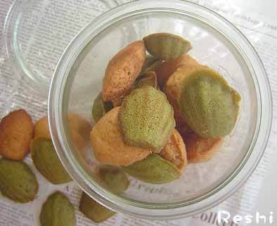 小さな小さなマドレーヌ♪かわいいぃ~~~~~ぃ!→ミニマドレーヌを入れたくなるかわいいガラスジャー緑色のが、抹茶のマドレーヌ。ピンクのが、桜のマドレーヌです♪桜の葉の塩漬けが入っています。実はどちらも、ちょっとだけ失敗なのでした。抹茶はベーキングパウダーを入れ忘れ、桜は、型に油を塗り忘れボロボロ。もう1回作ってみよ~~~っ♪抹茶と桜のマドレーヌレシピ(マドレーヌ貝型10個付・4枚で40個分)■材料 薄力粉・・・・・・80g ベーキングパウダー・1g 砂糖・・・・・・・60g 溶き卵・・・全卵1個と卵黄1個(あわせて約80g) 溶かしバター・・・40g 溶かしマーガリン・40g はちみつ・・・・・12g※抹茶のマドレーヌは、上記レシピに抹茶小さじ1を入れる※桜のマドレーヌは、上記レシピに紅麹小さじ1強と桜の葉の塩漬け2枚を刻んで入れる。■作り方 上記材料を粉類から順番に混ぜ、冷蔵庫で30分以上休ませる。 型にバターを塗り粉をうすくつけておく。 型に均等に入れ、180度のオーブンで10分~15分焼く。 (途中、型の向きを変えるなどして均一に焼き色をつける) 2008.3.15UP ナショナルスチームオーブンビストロ(NE-SS30)で作成ミニマドレーヌ型は買ってからずっと戸棚の中にありました。ラベルついたままのピッカピカの型。使うのがもったいないほどきれい。ようやくデビューとあいなりました!■本日のおすすめキッチンアイテム一口サイズのかわいいマドレーヌが焼けます♪ブリキ(スズメッキ鋼板)の型はバターをぬって焼けば、こびりつきなくきれいに型離れします。シリコン加工より安いです! ブリキ マドレーヌ貝型 10ヶ取 No.119型離れがよく長持ち シリコン加工マドレーヌ貝型 10ヶ取 No.148 ■サイズ共通:約210×125×h10mm(ナショナル30Lタイプのオーブンですと1段に2~3枚並べることができます。) ●スチームオーブンレシピ一覧 米粉マドレーヌのレシピ