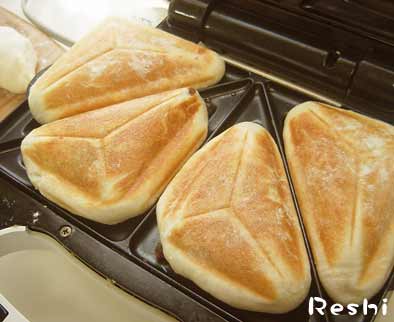 カレーパンが作りたくなり、スーパーで見本となるカレーパンを購入! よーく味わってイメージトレーニング!カレーパンの具のカレーはおいしいなあ^^じゃがいも多めで、香りのスパイスが効いているのねー。なるほどー。よおーしっ! 作るど~~~~~っまず、ホームベーカリーにパン生地をセットし、その間にカレー作りです。ぼやぼやしてたら、パン生地の方が先にできちゃった!急げ!急げ!じゅわー~~~~っ♪ できたー☆あはっはは。またもや、中身が噴出しております!これは、簡単でおすすめ~~~~~っ!次男がこのカレーパンを気に入りまして、独りで4個も食べてました!ホットサンドメーカーでカレーパンレシピと作り方●20個分パン生地(1斤分) 強力粉・・・・280g 塩・・・・・・5g 砂糖・・・・・17g スキムミルク・10g マーガリン・・15g 水・・・・・・180g ドライイースト・3g●カレー じゃがいも・・2個 玉ねぎ・・・・1個 にんじん・・・適宜 豚牛合挽き肉・200g にんにく・・・適宜 水・・・・・・150g 中辛カレールー・2ブロック ガラムマサラ・・適宜※卵1個とパン粉●作り方>>ホームベーカリーのピザ生地コースで生地を作ります。>>フライパンで、にんにく、玉ねぎ、挽肉、じゃがいも、にんじんを炒め、 水とルーをいれまぜる。最後にガラムマサラで香り付け。>>パン生地は20等分する。1個25~26g カレーを包み溶き卵とパン粉をつける。>>ホットサンドメーカーに油をぬり、カレーパンを焼けばできあがり! 焼いていると、最初蒸気がでてきて段々それがでなくなってきます。 それが大体焼けてきた合図。確認しながら焼いてみてください。2008.3.25UP ホームベーカリーとバラエティサンドベーカーで作成いちおしホームベーカリー安い順→ホームベーカリーSD-BM101あると楽しい♪おいしい♪安い順→ビタントニオ バラエティサンドベーカー>>ビタントニオシリーズ一覧カレーパン作りに便利な食材もありました!★カレーフィリング特集★【ホームベーカリーのレシピィ】無料メルマガ 今月は新企画がスタート!お楽しみに♪ ホームベーカリーレシピ集 ワッフルメーカー比較とレビュー