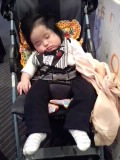 たいちゃんは現在6ヶ月後半。太めのたいちゃんは5ヶ月後半で初めて寝返りし、1ヶ月ほど経った今、寝返り上級者ですクルンっとうつ伏せになってはしばらくそのままの体勢でキョロキョロ見回しそれからママにヘルプを求めます(笑)まだ自分で仰向けに戻れません。3月28日、片方の玉が少し腫れていたので小児科へ。陰嚢水腫と診断されました。「お母さん、これ両方腫れてるわ。」と言われびっくりしましたが、「なにもしなくていいです昔は針さして水抜きとかしていたけど、今はしないんです。このままで。」と自然治癒でいいそうです。根元も腫れてきたらヘルニアが考えられるけど今の状態では大丈夫とのことでした。4月9日、私の友達の結婚式へ。長男ゆうちゃんはパパとお留守番していただき私とたいちゃん2人で出席してきました☆実はたいちゃん、生後6ヶ月にして今まで結婚式に2度も出席しています。写真は披露宴の半ばで熟睡中のたいちゃん寝ている隙に、私はお料理フルコース全て完食☆おいしかったぁ欲を言えばお酒も飲みたかったなぁ。。。乾杯の時のシャンパンがとても美味しそうだったのです。授乳中の身、最初の1口だけで我慢しました。今、我が家のまわりはまさに結婚ラッシュ!去年の8月から続く続く…8月、9月、11月は2度、そして今年に入り1月、4月、今年8月にも結婚式の予定ですめでたくて良いけれど出費も痛いね離乳食は、6ヶ月を過ぎてから開始昨日から2回食にしましたでもまだお口をアーンしないんですよね…スプーンを持っていくと舌をベーと出すのです。舌の上にスプーンをのせるとチューとお粥を吸います。様子見ながらゆっくりすすめていくつもりですそれから、サイドの髪があまりにも長く伸びていたのでカット!少しスッキリしたのわかるかな??出掛けると毎回「女の子だよね?」って聞かれるたいちゃん。これで今度から間違われないよきっと(笑)