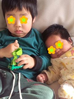 一昨日の夜中の出来事です。家族みんなグッスリ寝ていました。たいちゃんが泣いたのでおっぱいだと思い、授乳しようと起きてふと見てみると…2歳のお兄ちゃんゆうちゃんが6ヶ月のたいちゃんの上で、乗っかって寝ているではありませんか重くて苦しくて泣いていたのです。。。たいちゃんのお腹の上にゆうちゃんはうつ伏せで横たわって寝ていました。ゆうちゃんは寝相が大変悪く、夜中ゴロゴロしながら布団を1周してるんじゃないかってくらい動き回ります。パパと私の間で寝ていたゆうちゃんがいつの間にか私の頭上を通り越え私の隣の布団で寝ているたいちゃんの所まで行っていたことにビックリです。しかも無意識で赤ちゃんの上に乗るだなんてなんてこった。。。