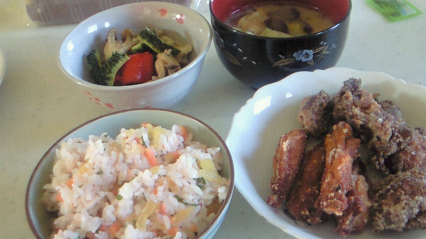 今夜は、何にしようか?ゴーヤー、シメジ、パプリカを素揚げにしてサラダっぽく。