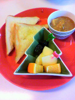 シュガートーストと昨晩の残りのカレー、フルーツ盛り合わせ