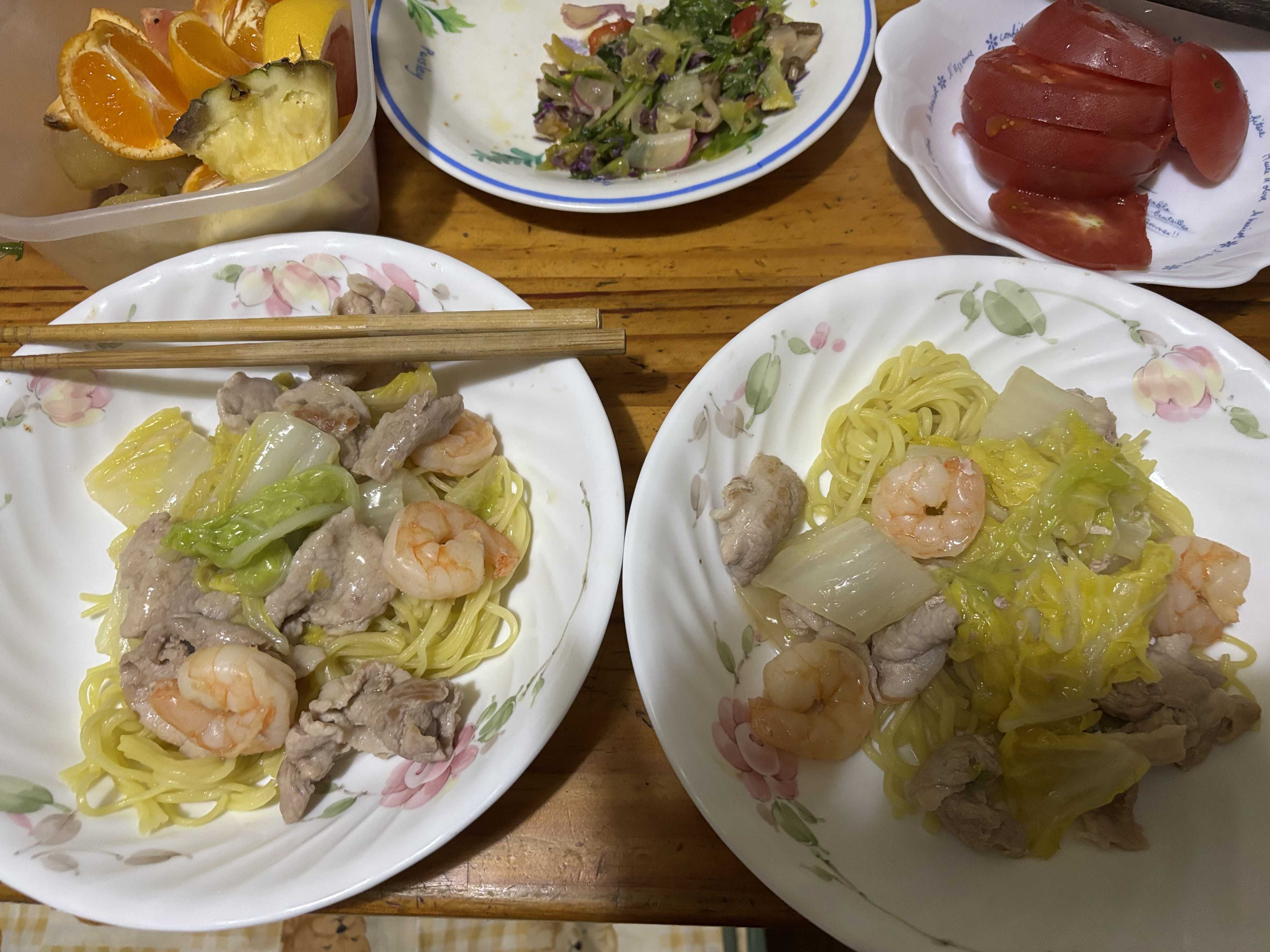 昼。あんかけ焼きそば 麺半分 大きなエビ奮発、豚肉いっぱい