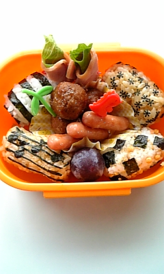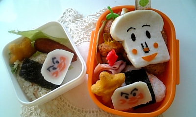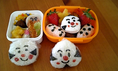 今日もパパ弁でございます 前日本屋でキャラを探していたみたいです 今回はおむすびまんに、こむすびまん 最近我が家ではアンパンマンブームで レンタル屋ではいつもアンパンマンを借りてきます でもアンパンマンキャラって結構いるんですね