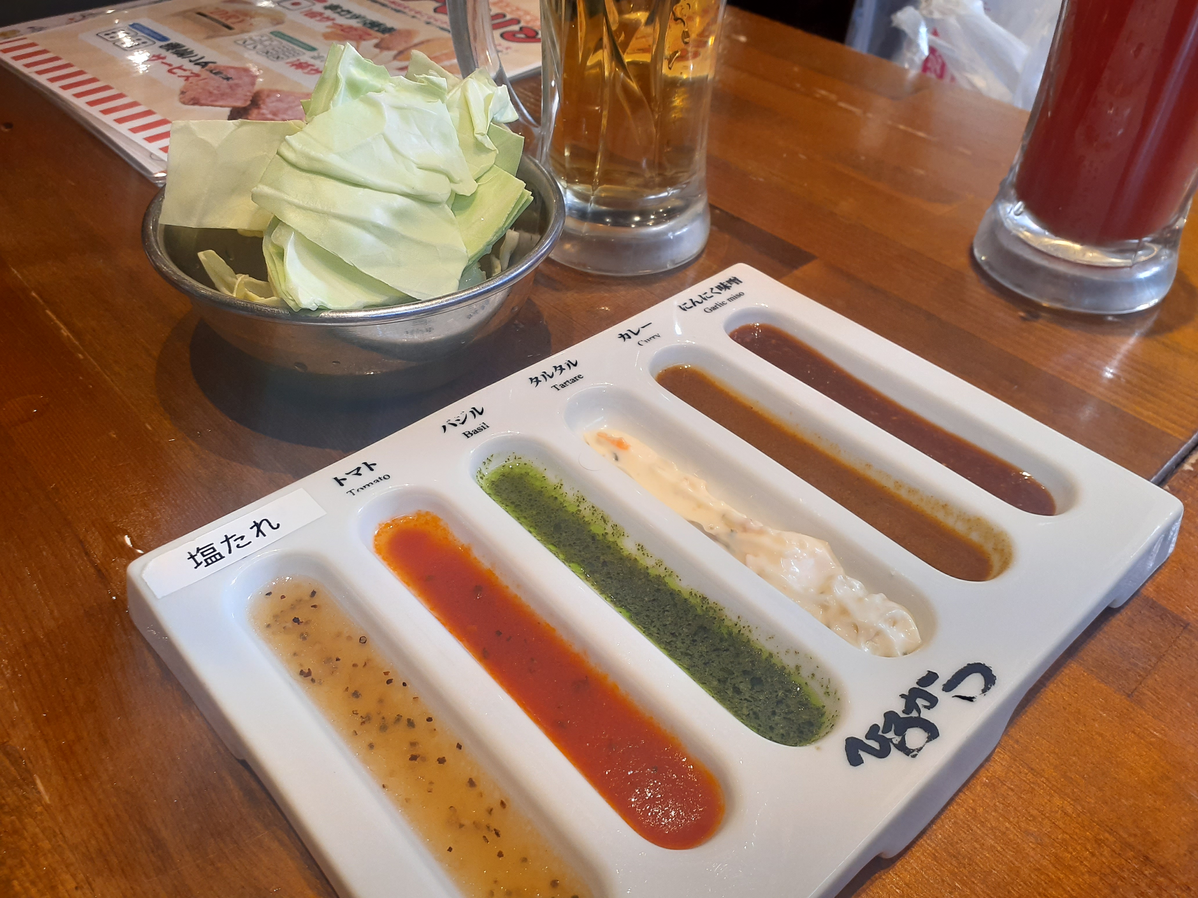串カツ屋さん??お通しのキャベツにつけるタレ種類いっぱい。串カツにも使えるんだって。