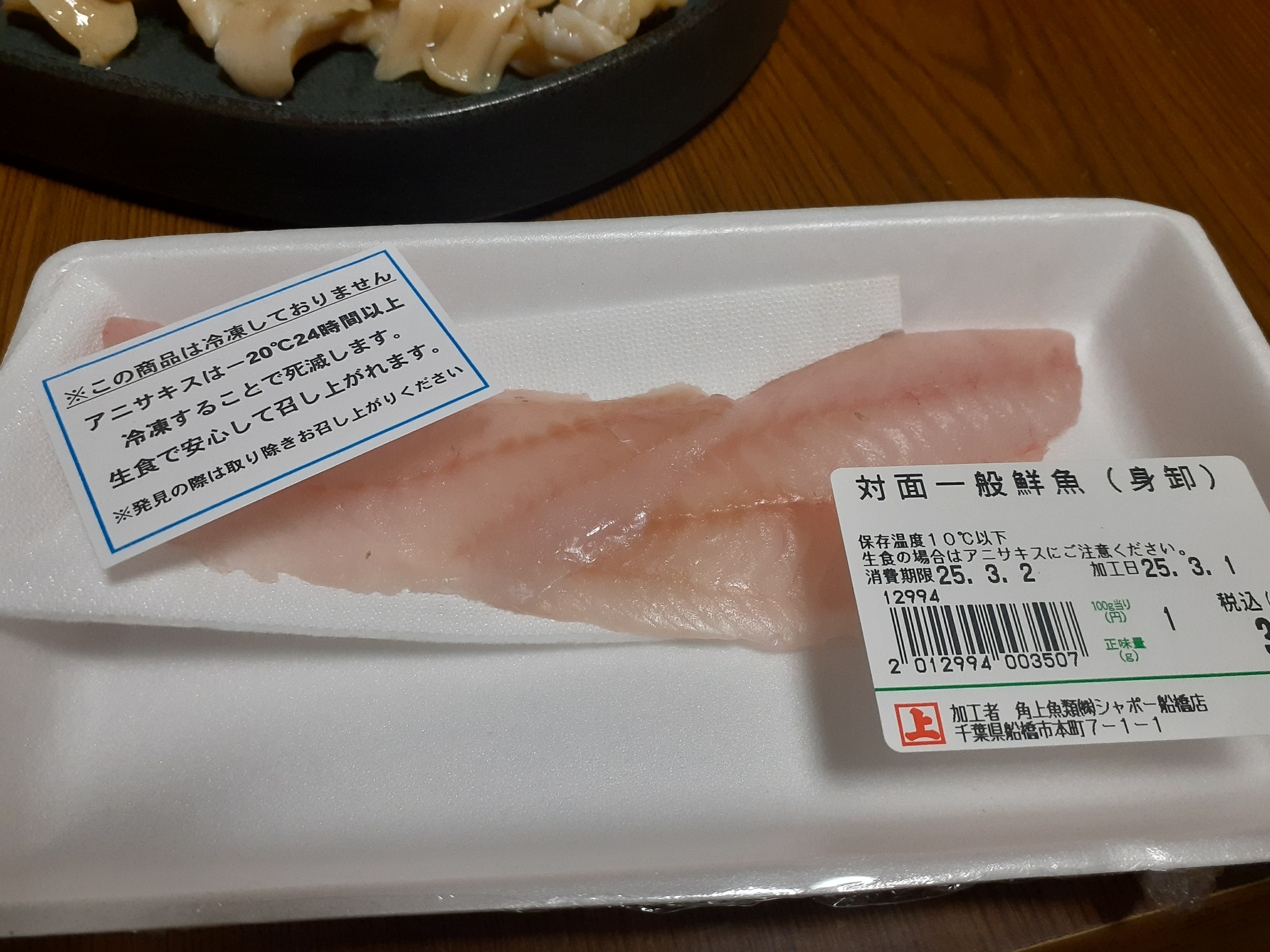 今日もいつもの夕方です。ってか、久々じゃない??雨。昨日あんだけ暖かかったのに、さっき雪降ってたし。でも自然界には雨って大事だよね。ここ最近野菜が高いのも雨不足だったからって言うし...降れば降ったで文句言うし、降らなきゃ降らないで文句言うしニンゲン...ワガママ...とか神様言ってそう。土曜日。角上行きたーい!肉食べたーい!!と欲望を満たすため、毎度の船橋に行ってきました。(あ。午前中はお仕事ね)船橋角上着。久々の再会ミル貝ちゃん♥と、いっつも名前忘れちゃうやつをお刺身で頼んでおいてから、ワイズマートへ。オイラ肉を喰らいたいんだ。そしたらなんと!国産焼肉肉が定価から半額~!!!(まぁなんか高くない??って定価だったけど)でも喰らいたい!お肉が私を呼んでいる...そっと手を伸ばし、かごへいーーーんっっ!!その後角上でミル貝ちゃんを迎えに行って、途中のOKストアで買い物し帰って来ました。で、でね。角上で分かってたよ?お兄さんが注文間違ってたこと...いつも名前忘れちゃう魚、今回ちょっと小さかったから2匹分お刺身用を頼んだ。でもできてたのは1匹分。また注文すると時間がかかるから、そのままもらったけど少ない...こんなんすぐ食べちゃう。隙間もすきすきでパックにも悪い。やっぱ少ないなぁ...気持ちを切り替えまして。お皿買いました!縁が高いのとちょっといびつな感じがよき。早速使いたくって、ホタルイカに使ったけどホタルイカと色が似ててバエない...(笑)こっちは大皿パターン。こちらもよき。ミル貝ちゃんもっさり盛ったった!でもさ、流石にミル貝多かったよ。なんか食べ過ぎ?結構いいお値段だったから残しちゃだめ!ダメ!って奮い立たせ食べてたけど、暫くはいいかな(笑)皆さん、食べ過ぎには注意しましょう!でも。おにゅうのお皿。楽しみ~♪何に使おうかな?料理も楽しくなるね。