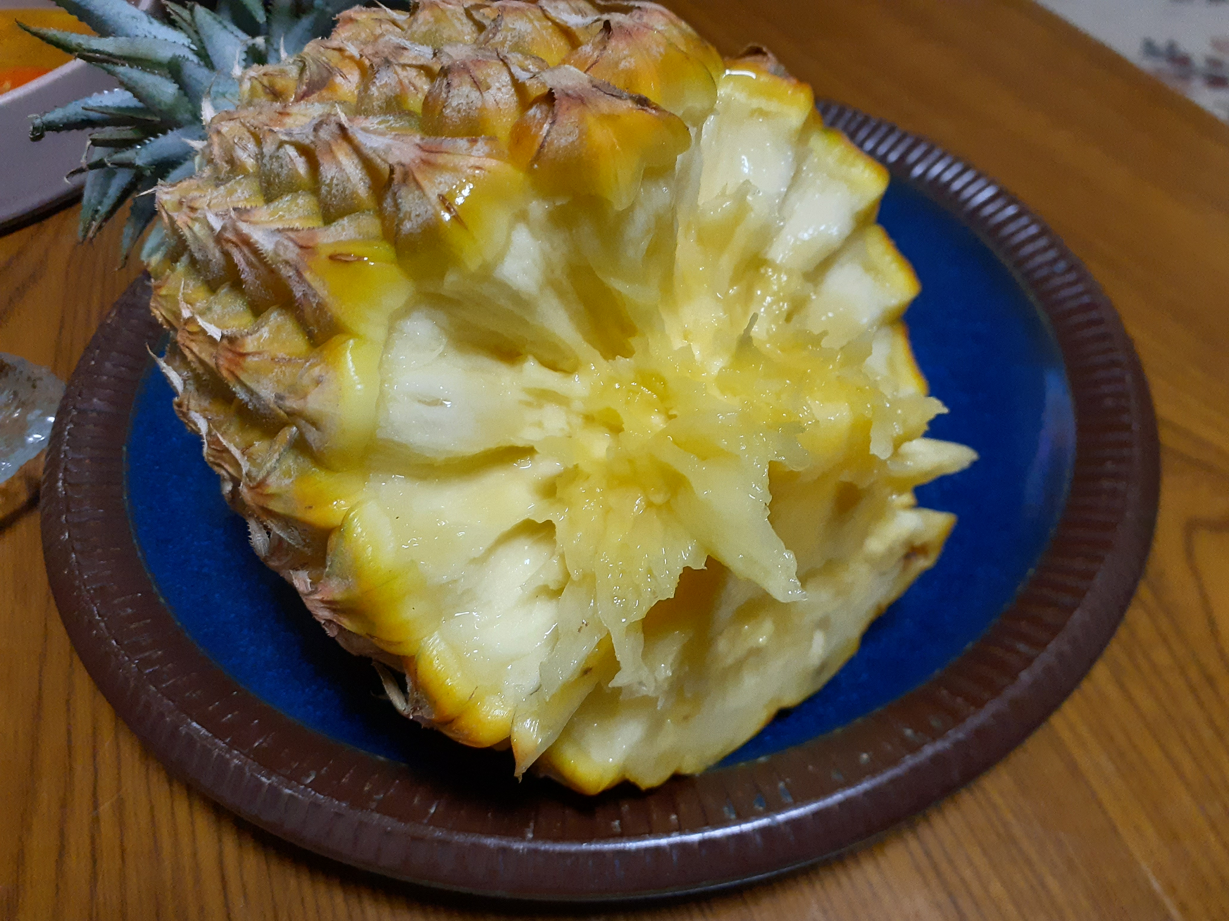 今日もいつもの朝です。月曜日なのに...ちっ!疲れてやがる。なぜだ!歳だからか?二度寝したからなのか?(笑)昨日は母の日でした。まぁ安定のリオ。なーんもねぇ。期待もしてないけどね。ははは。昔はイカのお刺身くれたけど。昨日は朝帰りだったけど。まぁお互い健康でなにより!(笑)GW前に郵便局に行った時、偶然見かけたスナックパインのチラシ。TVで見た千切って食べるタイプのパイナップルね。なんか楽しそうじゃない?やってみたい!やってみたーい!と思ってた。3,000円ぐらいで3個(小さめ)送料込み。うぐ...買えない金額ではない。チラシをバッグに忍ばせ仕事場に帰る。注文寸前...までいったけど、コレ楽天でも買えるんじゃない?ちょっとポイントあるし。で、ポチ。GW後、キター!ちょっと緑の所あったけどいい香り。到着時が完熟らしく早速1晩冷やして千切りました。うん!甘っ!ウマっ!千切っては食べ千切っては食べ...めっちゃ食べた。食べ過ぎて下唇ちょっとピリピリ。翌日。ちょっと面倒臭くなってきた(笑)残り全部千切ってやりました!シャキーン!もう食べるのみ状態。うん!楽しい!美味しい!やってみたかった食べてみたかった事だったので、できて嬉しーい。一個は日頃お世話になってる実家へ。そしてもう一個まだ残ってる。ふひ。美味しいうちに早く喰らいつくそうっと。