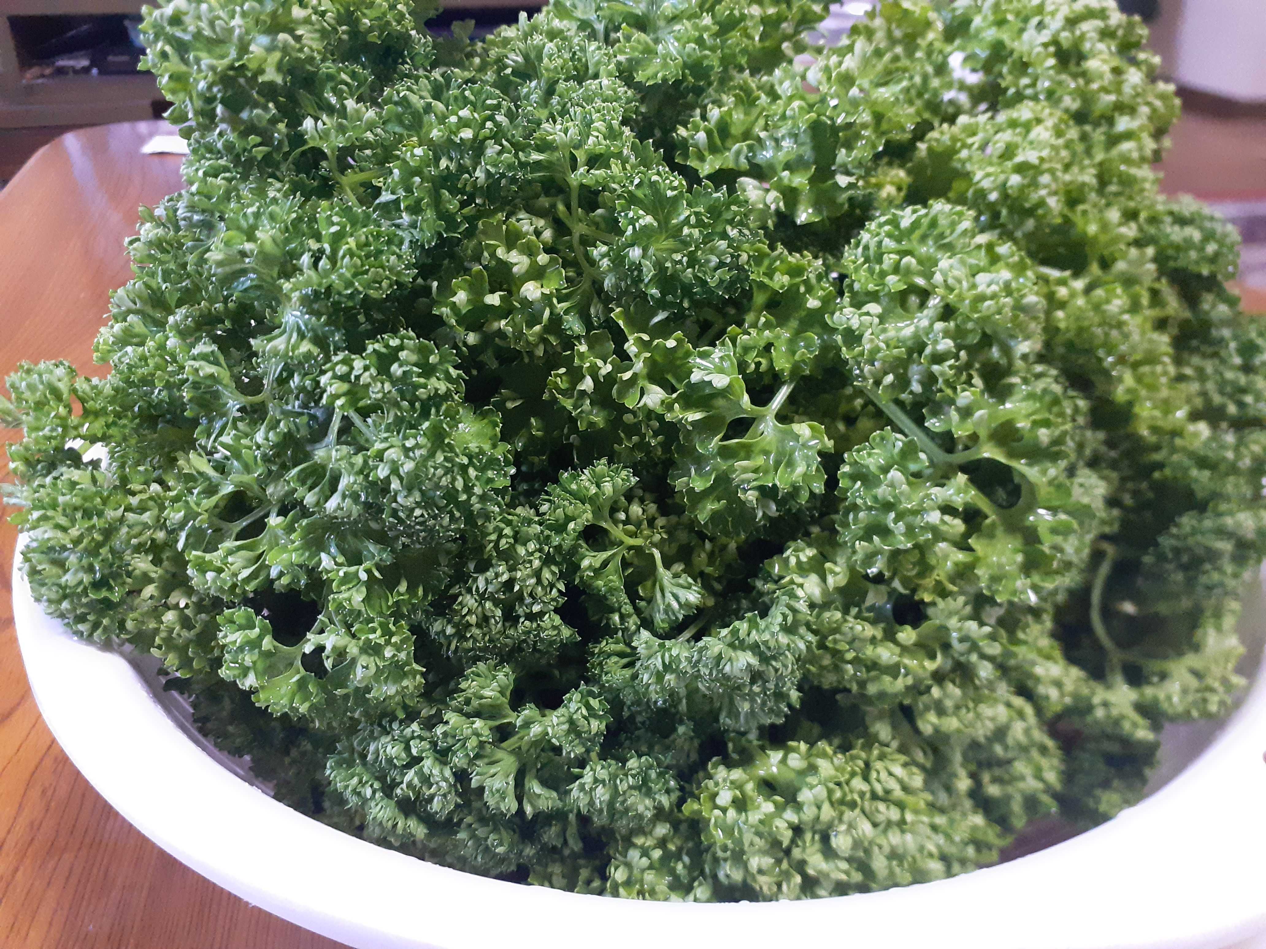 乾燥パセリについてお話したいと思います。うちは結構パセリを使う家でして、生パセリがあったら買ったり乾燥パセリも常備しております。でも生パセリは最近高いし、乾燥パセリも量が少ない。(あっ!因みに...育ててたイタリアンパセリはずいぶん前にお亡くなりになりました。やはり私は植物を育てる能力は乏しく、少し新芽が出たぐらいでその後根が腐ってしまいました)な~の~でえ~、100円ぐらいでもっさもっさの生パセリがあると買って乾燥パセリにします。土曜日母とジャパンミートに行った時みっけた100円もっさもっさパセリ。洗って水を切ります。手で茎を外します。これが結構面倒臭い。お皿の上にキッチンペーパーを敷いて、上に平たくなる様(こんもりしない)置きます。で、レンジでチーン!小っちゃくなっちゃった!(笑)あの量でコレ。入れ替わり立ち代わり何度チンしただろう...。でコレ。でもこのまま冷凍し結構使える。緑も綺麗だし多少香りも残ってる。面倒臭いからおススメ...まではいかないけど、生パセリが残ったらお試しあれ。
