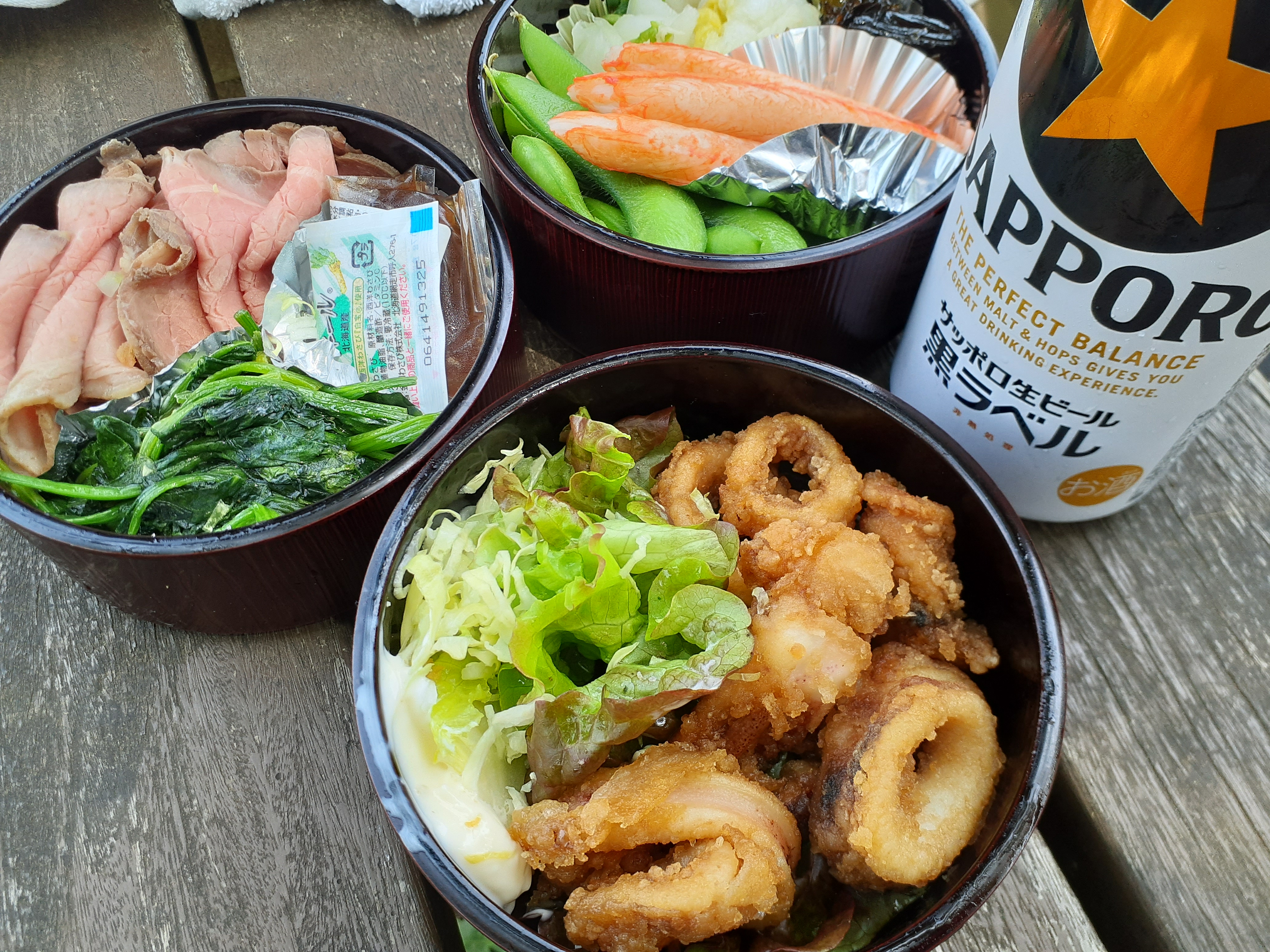 今日もいつもの朝です。洗濯日和ですよーって。良い天気だぁ。ここ最近暑いです。土曜日もめちゃくちゃ暑かった...午前中はお洗濯お掃除お買い物して~こりゃお外で飲んだら気持ちよさそうだねって話になり主人と公園に行ってきました。やっぱ天気いいから公園も人が多い。あっちの木陰でもぐもぐ。こっちの木陰でもぐもぐ。みんな楽しそう。私らも木陰のベンチを発見し...買ったお惣菜と家にあった物でもぐもぐ。はは。じじいばばあのおつまみだねぇ~漬物とかカニカマあるし(笑)鳩が寄って来ます。でもごはんあげませんよー。2週間前ぐらいは桜桜言ってた公園も緑が多くなったなぁ。いやぁ気持ちいいお酒でした。やっぱお外で飲むとなんか良いね。おつまみも何割増しか美味しい気がするし。カニカマ(笑)GWもどこも行く予定ないし、またぷちピクニックかな?