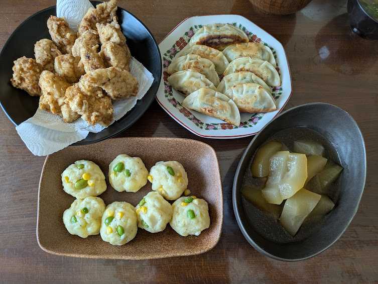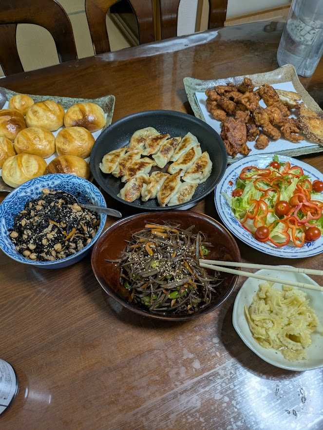 2025/9/23 (火) 11:53 //パン 手作り餃子 ささ身の唐揚げ チキンカツ 大豆入りひじき煮 金平ごぼう(ごぼう 人参 ピーマン) 生野菜(レタス 水菜 ミニトマト フルーピーレッド) 白ゴーヤピクルス 野菜スープ 白米 久々 家族で遊びに来てくれました あーちゃんの6番目と7番目の双子の孫ちゃん 小学6年生に暫く会わない内に 男の子は あーちゃんの背を越えてました 因みに男の子が6番目 女の子が7番目 女の子は が大好きのよう 喜んで嬉しそうに食べてくれてました 言葉数が少なくて おとなしいシャイな男の子よく食べるって聞いてたけど 小食気味 緊張してたのかな 息子さんは ガッツリ 飲んで食べておりました 寛いでもらっているようで よかったわ