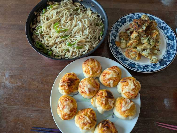 2025/8/12 (火) 11:42昼食 イタリアン 舞茸とピーマンのパスタ ( 仕上げにパルメザンチーズを振ってバジルを散らしたら完璧 なぁんて...考えてたけど ) 見事に忘れる パスタの横に写っているのが 新じゃがのり塩焼き 喜んで 食べて貰える 作者: あ——ちゃん■材料(2人分)新じゃが / 4コ(180g)◎藻塩 / 少々青のり / 小さじ2オリーブオイル / 大さじ1■レシピを考えた人のコメントボイルしてラップで挟んでつぶしてコンガリ焼いたらOK ♪♪食パンの生地をベースにアレンジのピザパン手作りトマトケチャップをぬってゴーダチーズをのせて焼きました 迎え盆の今日 次女家族が帰って来てくれ 雨の合間に歩いて墓参りに行きました 17:16 ////夕食は 中華にしました。レシピ検索 油淋鶏カリカリ揚がったお肉を ザクザク切って 香味ダレをジュ~とかけて... なぜか 力入れて作ったものは 思いが先行 写真には おさまっていないけど 野菜スープ ( 白菜 もやし 人参 春雨 玉ねぎ麴 藻塩 こしょう ごま油 いりごま ) 美味しい~ の言葉頂きました 喜んでもらえる味になって よかったわぁ 中学3年になる3番目の孫息子ちゃんと婿殿 夕食の後片付けをしてくれました。ありがとう ありがとう