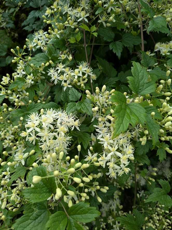 2025/8/21 (木) 10:04リュウキュウボタンヅル(琉球牡丹蔓)葉柄が他物に巻きつきながら成長する。葉は3出複葉で 対生する。小葉は先が尖った広卵形で 2〜3裂することもあり粗い鋸歯がある。6~7月頃、葉腋から花序を出し 長い花柄の先に多数のクリーム色の花を咲かせる。花は平開形で上向き~横向き 蕾も上向き~横向き。花弁はなく 花弁のように見える楕円形の萼片が4枚平開し中央には萼片とほぼ同じ長さの雄しべが多数放射状につく。花被片は白色で 雄しべは白。果実は先が尖った卵形の平たい痩果で先端には羽毛状の白い毛がつき 長く伸びる。年々上昇の気温の関係でしょうか リュウキュウボタンヅルの開花 昨年に比べて 2週間早い