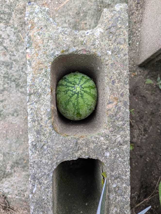 ブロック穴にすっぽりの小玉西瓜ちゃん 気が付くのが遅かった 救出しようと あれこれしてたら あちゃ~😵 茎が取れた 2025/9/9 (火) 8:33 /// 熱中症警戒アラート 33℃/23℃手を入れ やさしく西瓜をつかみ ゴキゴキ ゆっくりゴキゴキ 7月に買って来た小玉西瓜 甘くて とても美味しい西瓜でした 種取りして 芽が出るかどうか 試しに植えてみたんです。すると つるが伸び ぐんぐん成長して 気が付いたら 実が3コ出来ていました。もしかして... 食べられるかもと密かな期待 ブロック西瓜は全く気付かなかった グロックから引きずり出された超小玉の西瓜ちゃん キズが何だか痛々しい まだまだ未熟の小玉西瓜ちゃん 割ってみると ほんのり赤くなっていました。 実りに感謝し 美味しくいただきました
