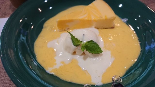 スイーツはチーズケーキにバニラアイス添え、マンゴーソースがけ