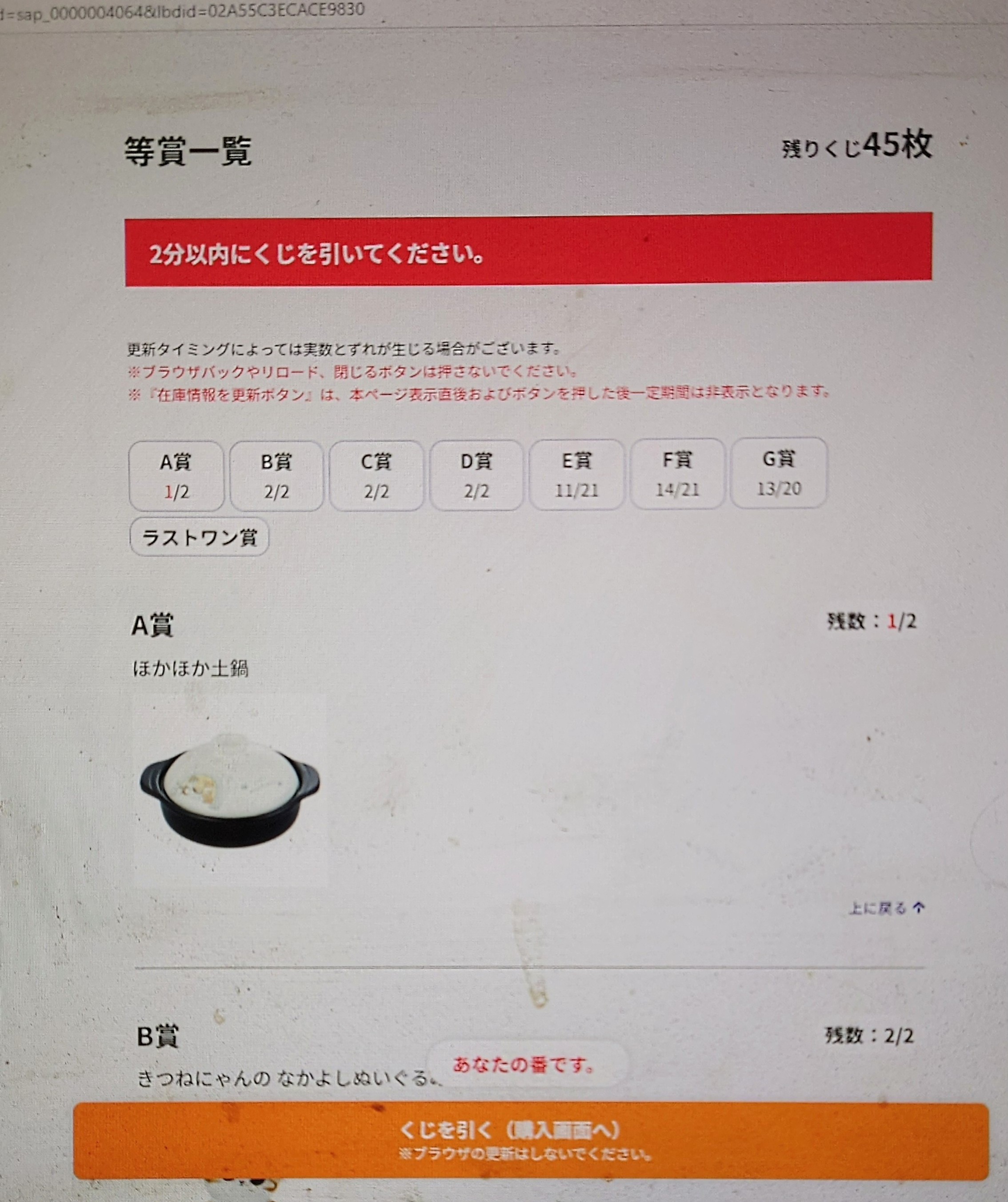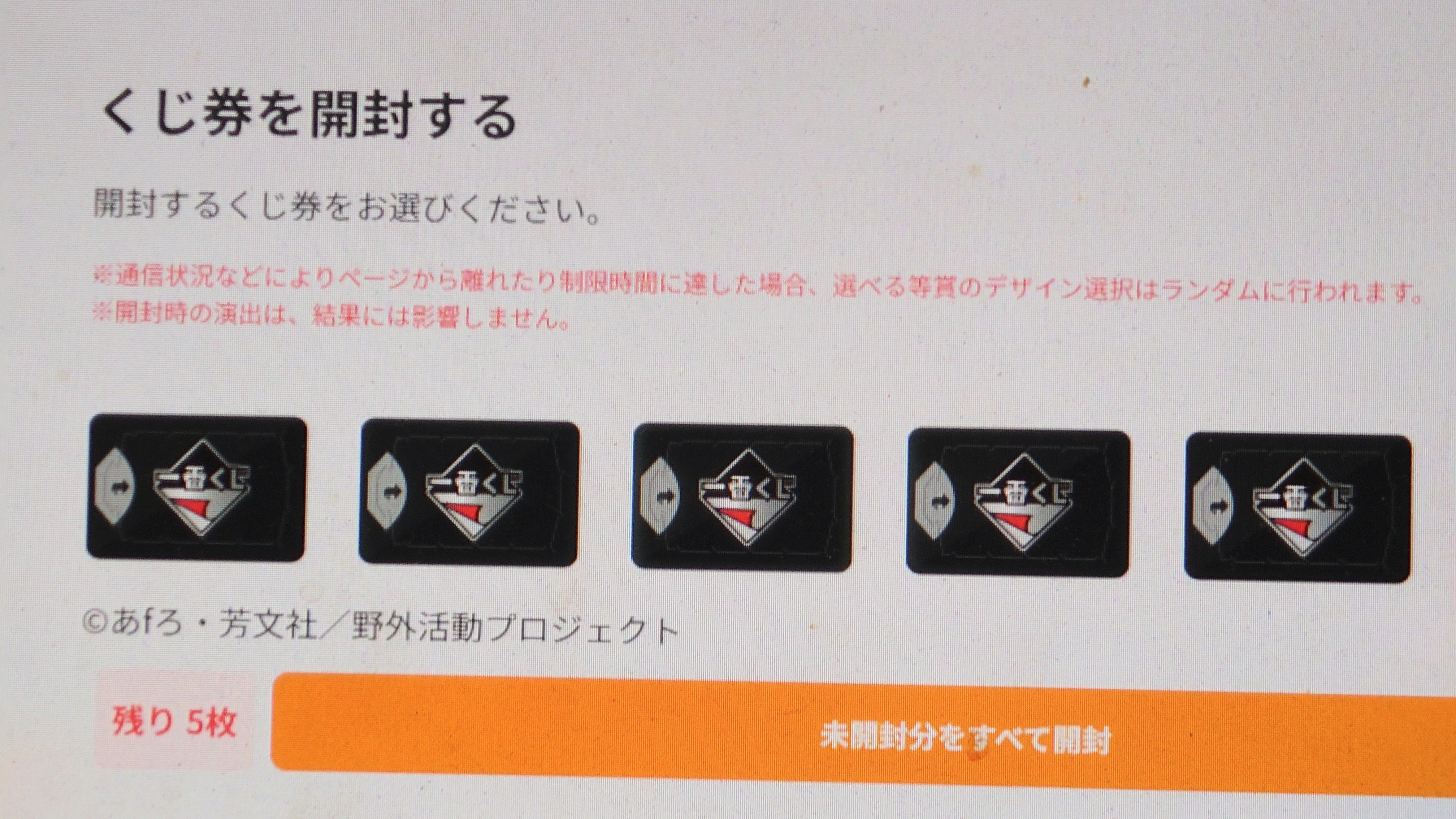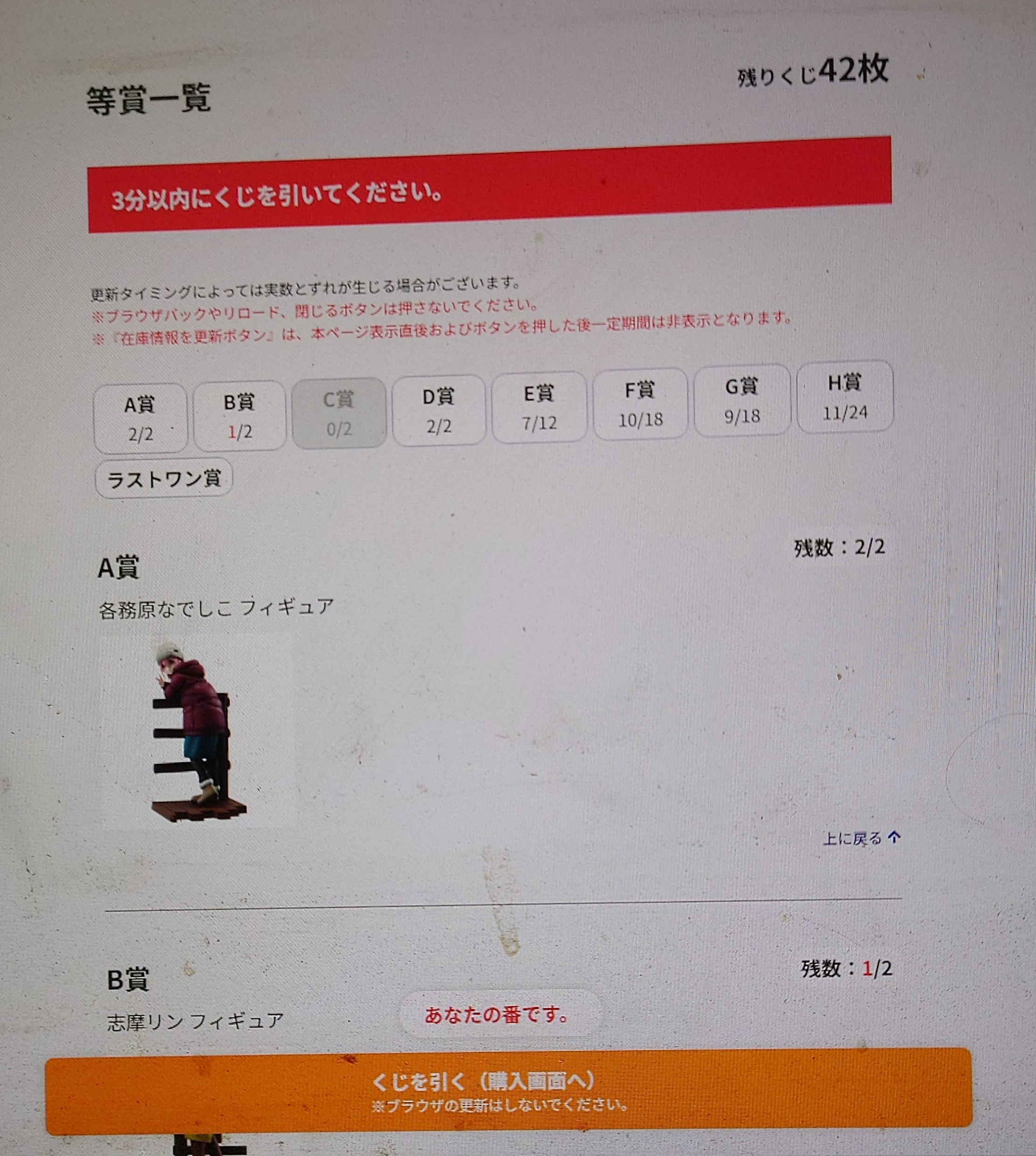 「『ゆるキャン△』 vol.2」ONLINE狙い 志摩リン&各務原なでしこ環境残り42本A×2 B D×2 下位賞37本フィギュア当選確率 1/145回だけ挑戦選んだ5枚4枚目なでしこ キターーーーありがとうございます!その他下位賞Eアクリルスタンド ×2FクリアファイルセットGポストカード&ステッカーセット何とかフィギュア×1当選しましたが、対になる志摩リンは、無理せずフリマで購入します、ハイ!