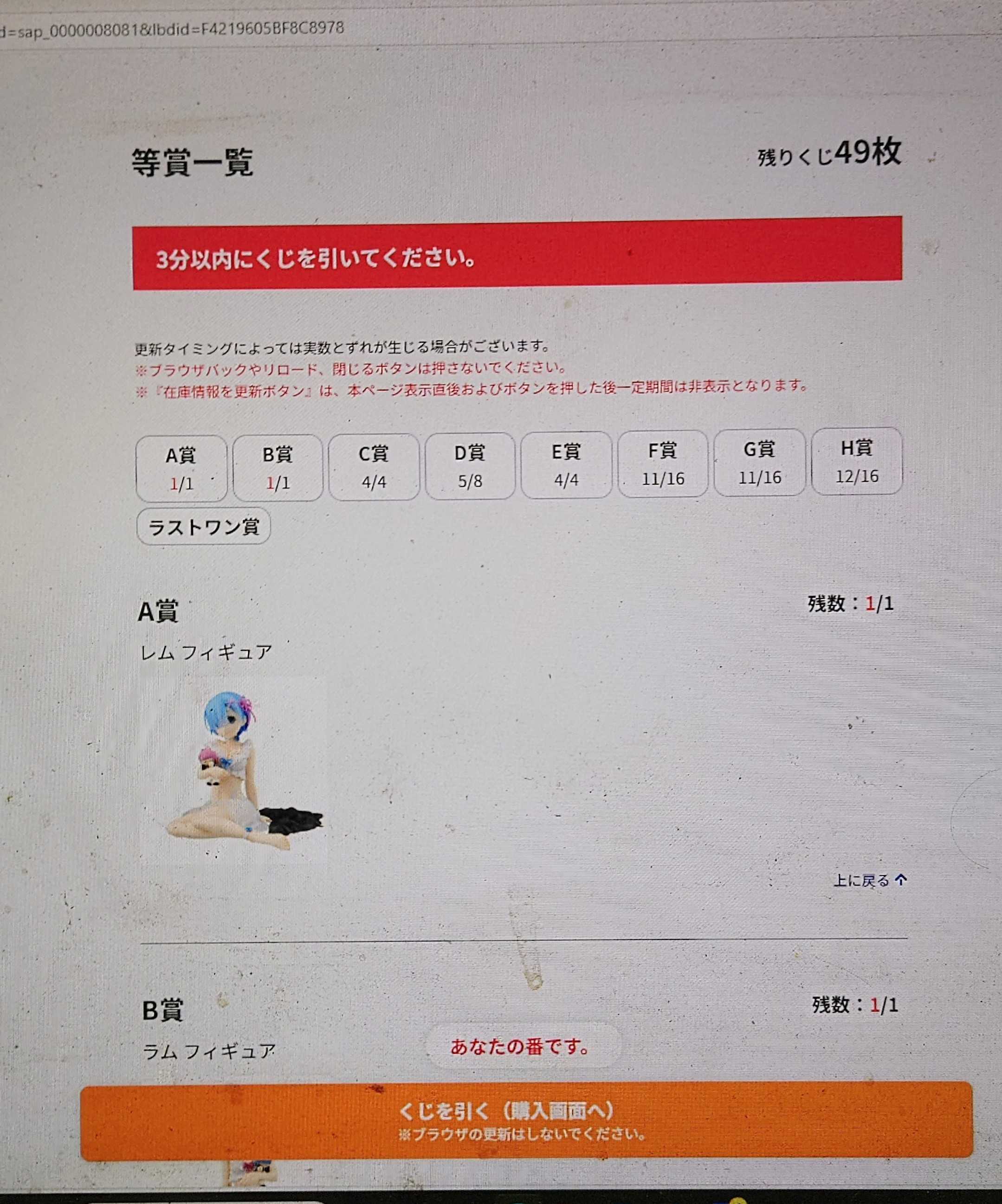 「Re:ゼロから始める異世界生活 -I will remember this day.-」ONLINE残り49本狙いレム元々アソート1なので厳しい!6回挑戦Cメタリックシートこれは嬉しいDちょこのっこフィギュア<※クローズド>その他下位賞Fタオルアソート ×2フェイスタオル:エミリア ハンドタオル:集合GアクリッツチャームレムHカップめんウエイトコースターベア子絵柄は可愛い…が、これ990円(税込)楽しみにしているホロライブ ~Wedding Dress Style~散財は控えるべきだが・・駄目だ、我慢できない
