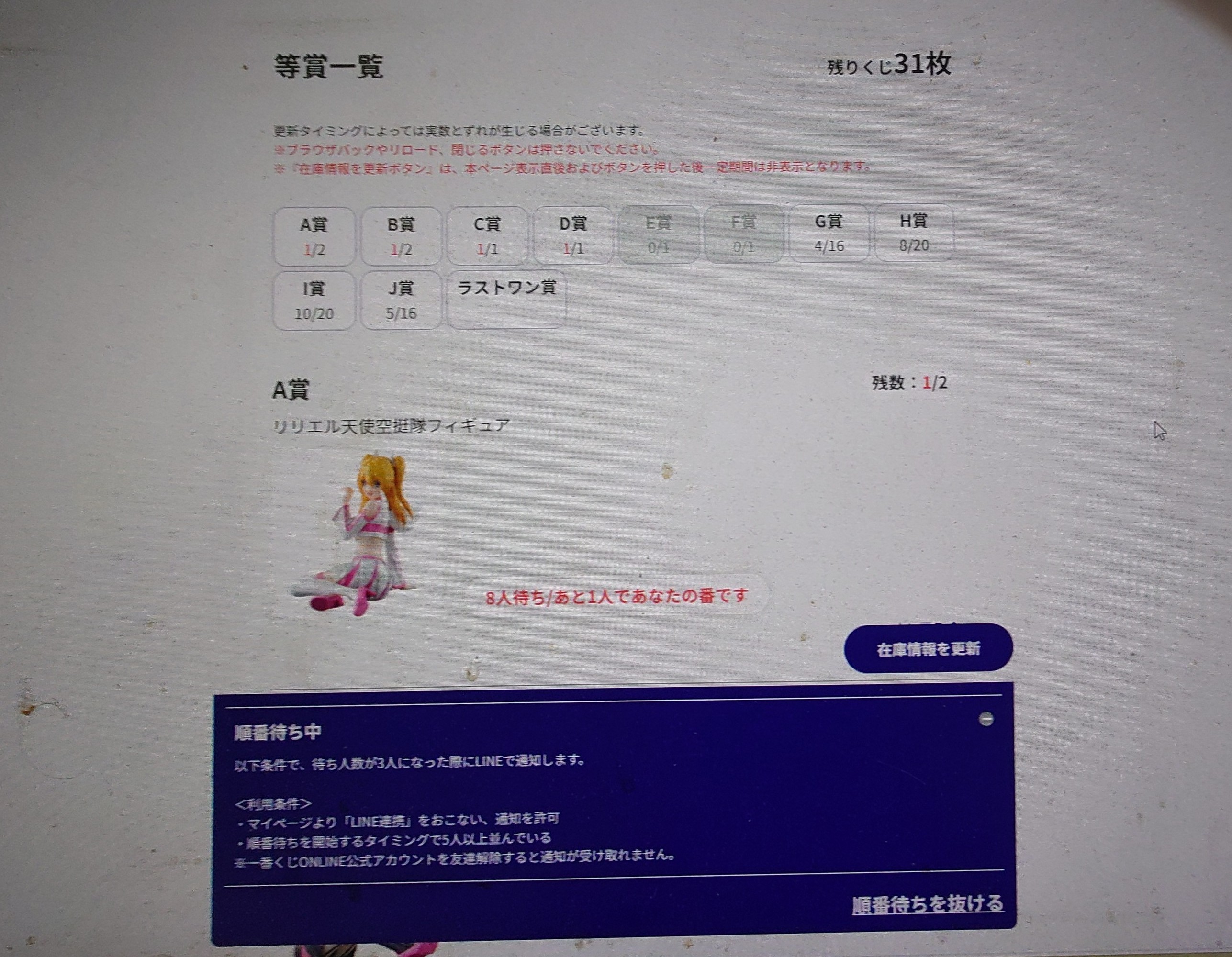 「 TVアニメ「2.5次元の誘惑」天使空挺隊集合!」ONLINE残り31枚で回ってきましたA B C D G×4 H×8 I×10 J×5フィギュア各1の2本のみ悪くも良くもない残り具合ですが…AorB狙いで5回だけ引いてみました~Aリリエル キターーーーーーーーーリリエル天使空挺隊フィギュアありがとうございます<(💛 _💛)>他はG(アクスタ) I(チャーム) J(タオル)×2ナルト引くつもりだったのですが・・・煩悩に負けました