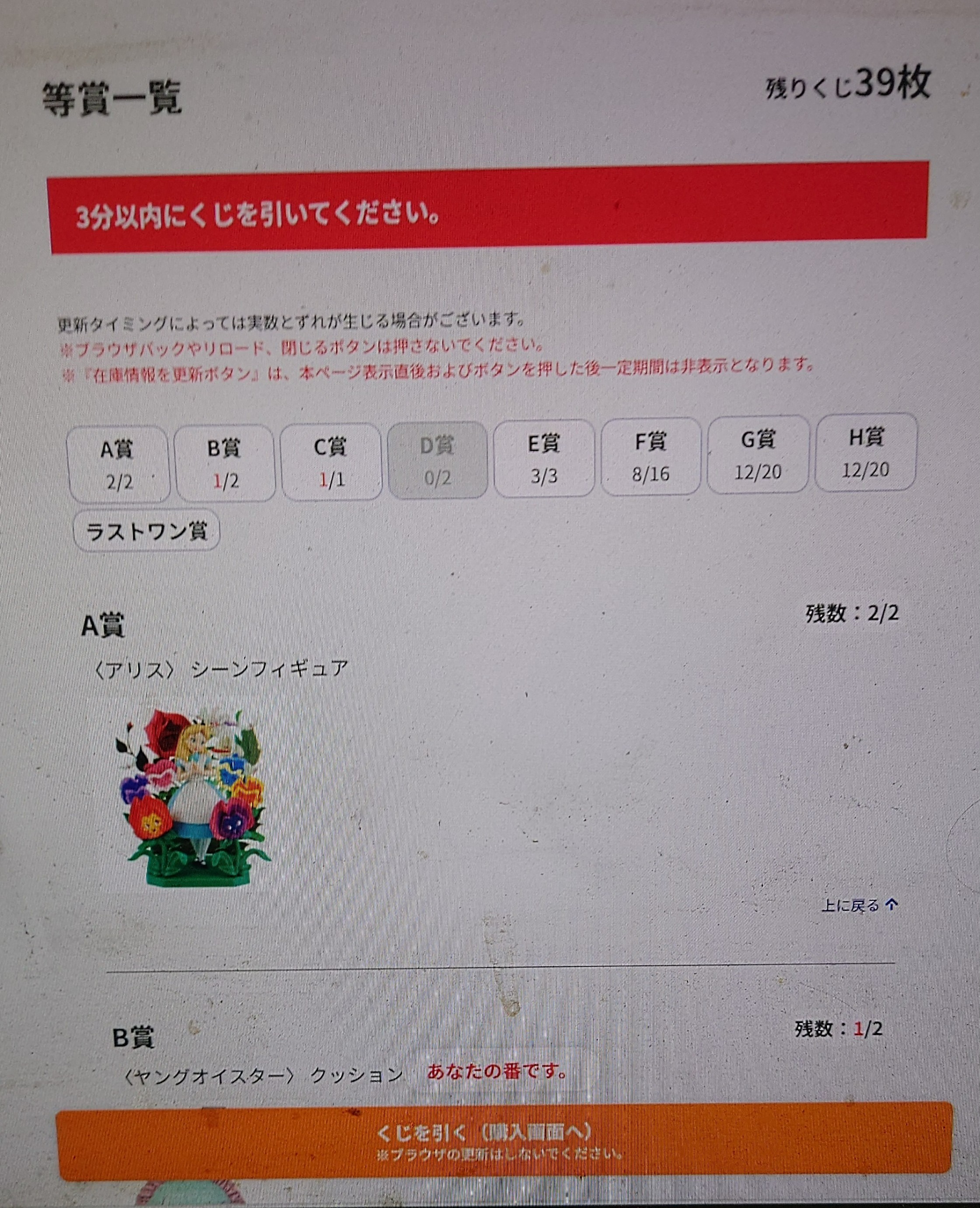 「〈Disney〉 Melody in a Dream 」ONLINE 狙い Eマリー残り39本A2 B1 C1 D0 E3 下位賞 326回挑戦B〈ヤングオイスター〉 クッション不思議の国のアリスに登場するゆるキャラどういう役割だったかは…忘れたその他下位賞F G H×3残念ながら マリーちゃんは当たらず・・今回は、これにて打ち止め!