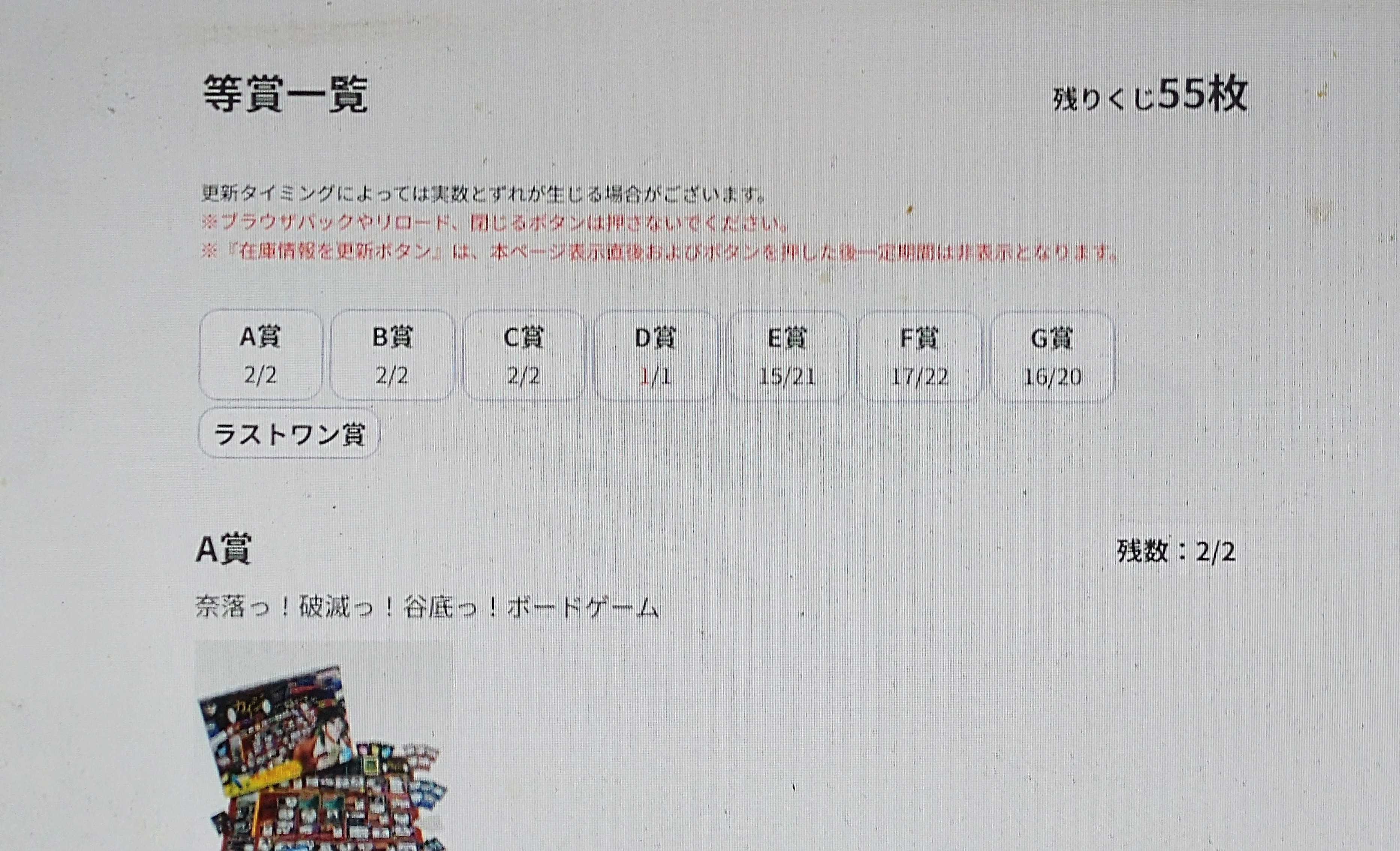 「 鬮奈落録カイジ 引かなくてどうするっ・・・!引く為に生きなくてどうするっ・・・!」ONLINE環境 A賞 B賞 C賞 D賞 E賞 F賞 G賞 2/2 2/2 2/2 1/1 5/21 16/20 17/22 残りくじ55枚狙いCCongratulation! 黒服フィギュアBざわ・・・ざわ・・・バスタオル 7回掛金 6.099円選択ざわざわ! 下位賞onlyかと思った7枚目 ざわざわ!A奈落っ!破滅っ!谷底っ!ボードゲーム圧倒的至福狙いでは無いですが、雑魚引き回避【結果】下位賞E圧倒的っ・・・!アクリルチャーム<※クローズド>×2 F僥倖っ・・・!チップ<※クローズド>×3 G 悪魔的っ・・・!ステーショナリーノートをセレクト挑戦する気は無かったのですが、カイジ好きなので引いてしまいました~来週末・・・狙い撃ち