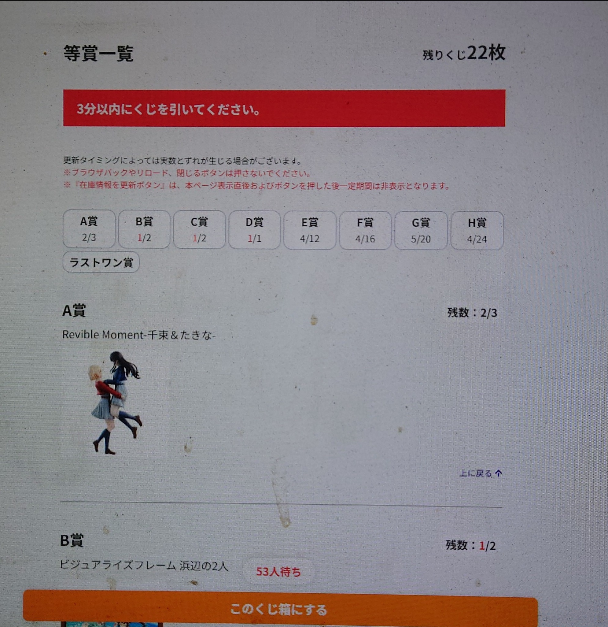 再「五等分の花嫁* ~五つ子より愛をこめて~」戦ONLINE二乃も欲しくなり、好環境を探して並んでいたら…残りくじ4枚A賞0/2B賞2/2C賞0/2D賞0/2E賞0/2 F賞0/5G賞1/5H賞1/10これは運命 全部ください案件4枚勿論、全買いさせて頂きます、ハイ!B中野二乃 フィギュア 1/7 Gracemaster ×2カワ(・∀・)イイ!! Gビッグアクリルスタンド (ぬくもりイラスト)Hビッグアクリルスタンド (お色直しイラスト)アクスタは五月しか残っていませんでした~ラストワンアラームクロック狙って無かったのですが、序に獲得前回と合わせてフィギュア 3/6 B×2 C G H×2+ラストワン出費は痛いですが、満足な結果でした