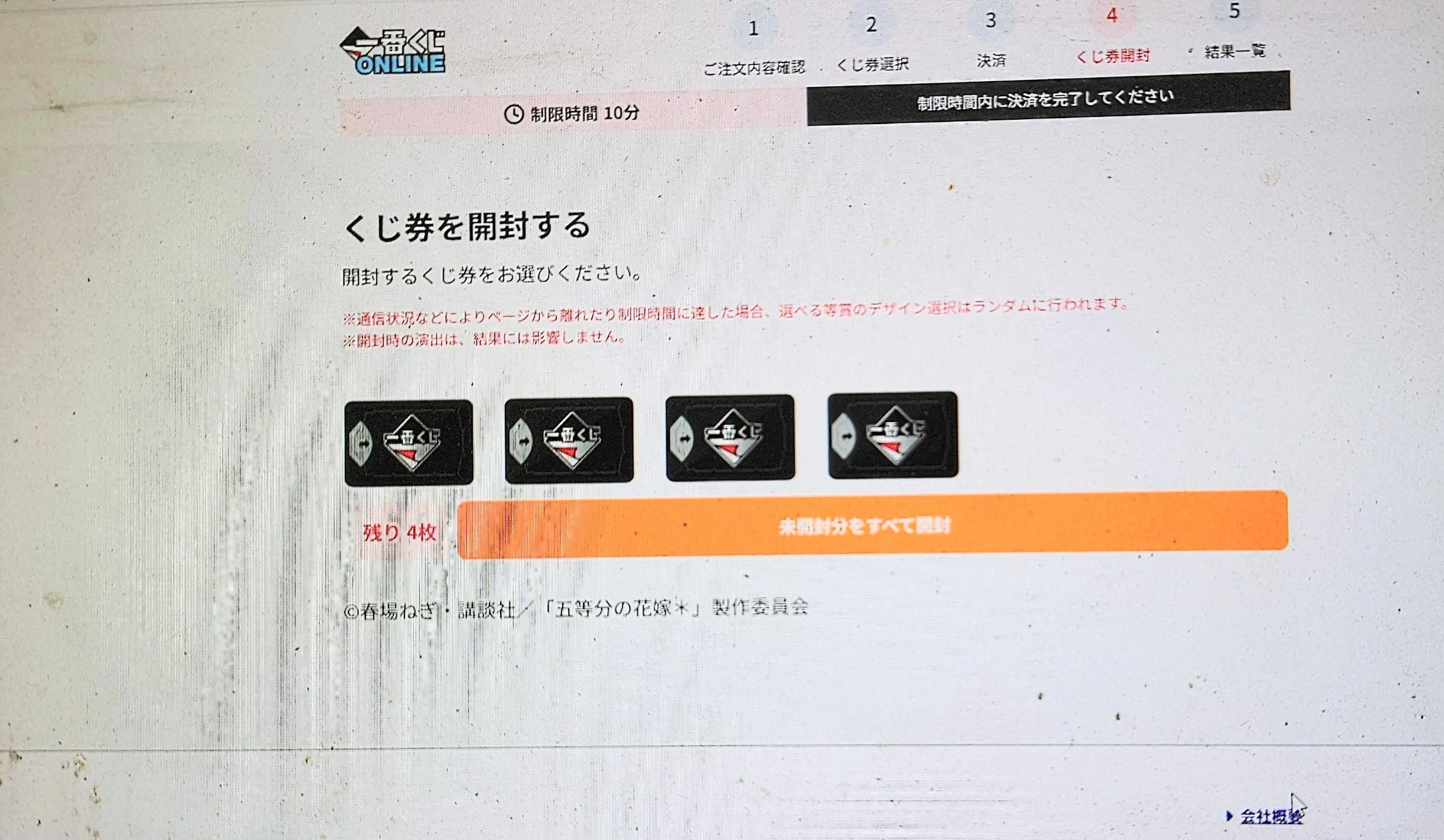 「五等分の花嫁* ~五つ子より愛をこめて~」ONLINE残りくじ25枚A賞2/2B賞2/2C賞2/2D賞2/2E賞2/2 F賞5/5G賞4/5H賞8/103000円/回 高っ高額くじですが、1/3でフィギュアが当たるなるほど納得運試しで2回だけ挑戦運命の選択 フィギュアは引けるのか?【結果】C中野三玖 フィギュア 1/7 Gracemaster三玖 キターーーー勝負に勝ったーーー!! ゴーーーールHビッグアクリルスタンド (お色直しイラスト)三玖をセレクト高額くじは、外した時のダメージがでかいので・・冷や汗ものでした~(;^_^Aフィギュアのデキは良さげなので、届くのが楽しみ(^^♪